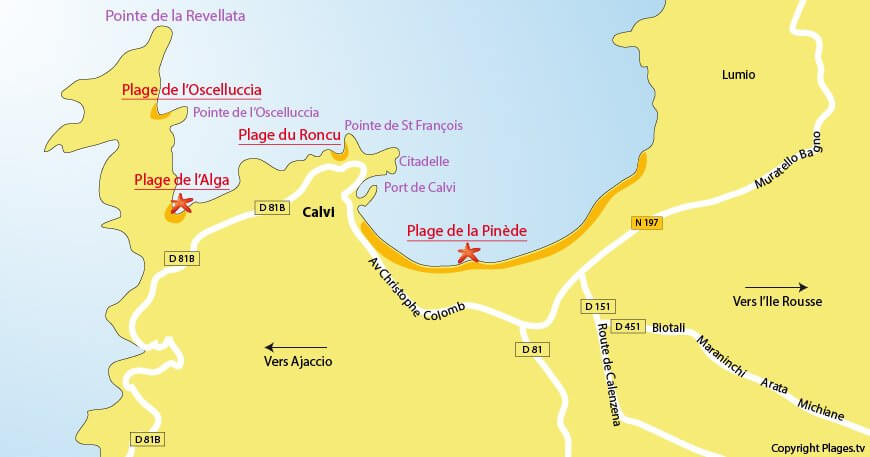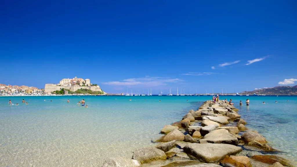 - La plage principale de Calvi s’étend sur 4 km avec un sable fin et des eaux peu profondes idéales pour les familles