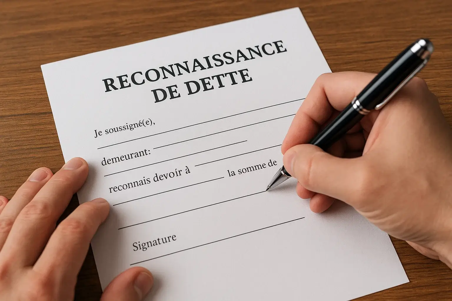Signature manuscrite : Le débiteur doit signer le document de sa main. Cette signature atteste de son engagement personnel. Pour renforcer la valeur juridique, certains ajoutent une mention manuscrite du type « bon pour reconnaissance de dette de [montant en lettres] » avant la signature.